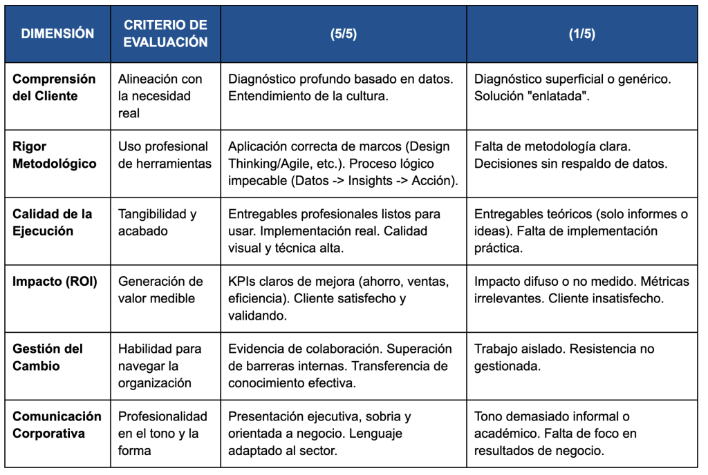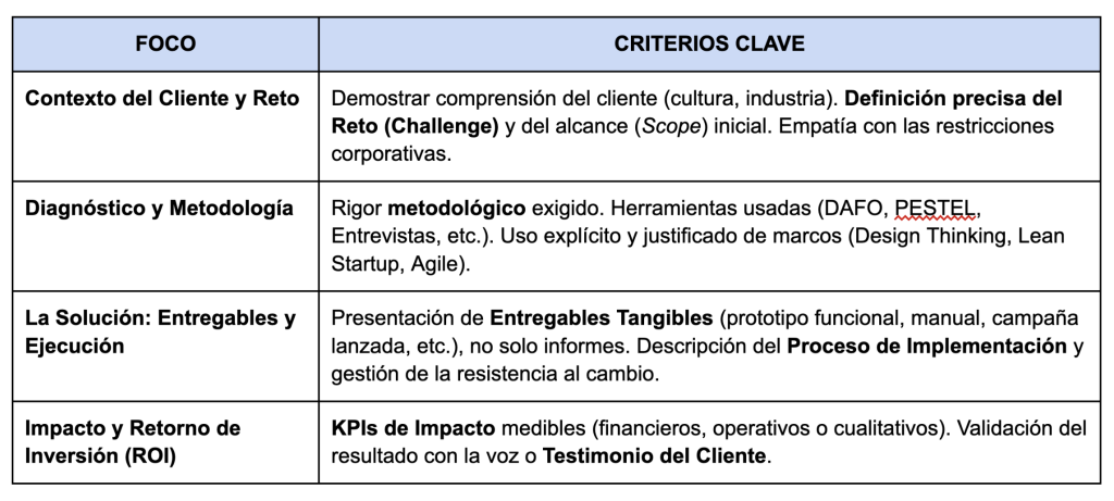 En el contexto del COP, tendrás apenas cinco minutos para transmitir tu mensaje. Y yo, como jurado, tendré apenas cinco minutos para evaluar si considero que has entendido de qué va el juego y, por tanto, activado los procesos de aprendizaje correspondientes. A modo ilustrativo, esta es la plantilla que yo mismo usé en el Demo Day de 2025, y que está completamente basada en los criterios que yo mismo utilizo cuando contratamos una consultora: