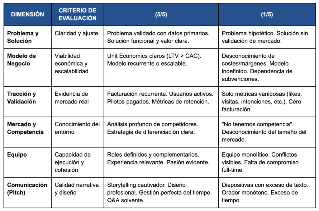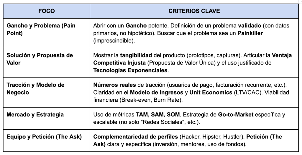 Tú tendrás, por tanto, apenas cinco minutos para pedirme algo y convencerme de que eres una buena apuesta. Y yo tendré, como jurado, apenas cinco minutos para evaluar si considero que has entendido de qué va el juego y, por tanto, activado los procesos de aprendizaje correspondientes. De nuevo, a modo ilustrativo, esta es la plantilla que yo mismo usé en el Demo Day de 2025, y que está basada en los mismos criterios que evalúo cuando me piden feedback de un proyecto o me planteo invertir en alguno: